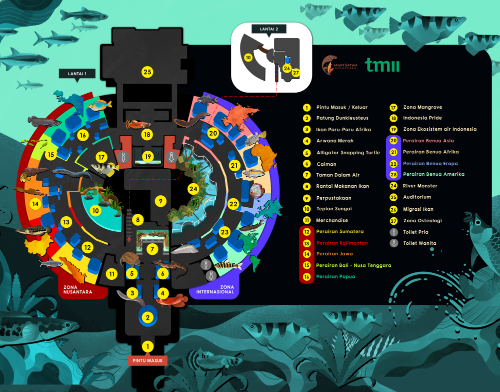 Dunia Air Tawar adalah zona eksplorasi yang mengajak pengunjung mengenal ribuan spesies ikan yang hidup di sungai, danau, hingga rawa Indonesia. Di sini, pengunjung bisa melihat lebih dekat keunikan bentuk, warna, dan perilaku ikan dari yang mungil hingga yang berukuran raksasa. Setiap akuarium dirancang menghadirkan habitat asli, membuat pengalaman belajar terasa natural dan menyenangkan. Pengunjung juga akan menemukan fakta-fakta menarik tentang peran penting ekosistem air tawar bagi kehidupan manusia. Tempat yang cocok untuk keluarga yang ingin belajar sambil bermain dan membangun kepedulian terhadap kelestarian satwa air tawar Indonesia.